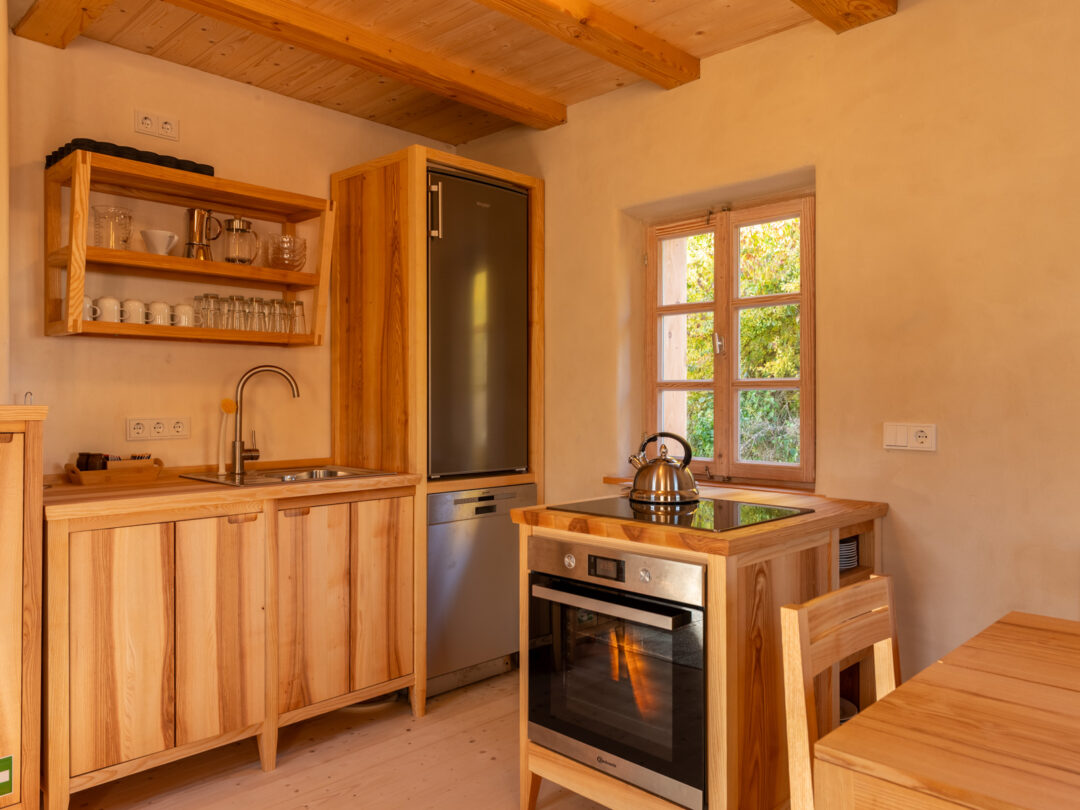 - Vollholz-Küchenzeile mitsamt (Koch-)Geschirr, Besteck & Gläsern