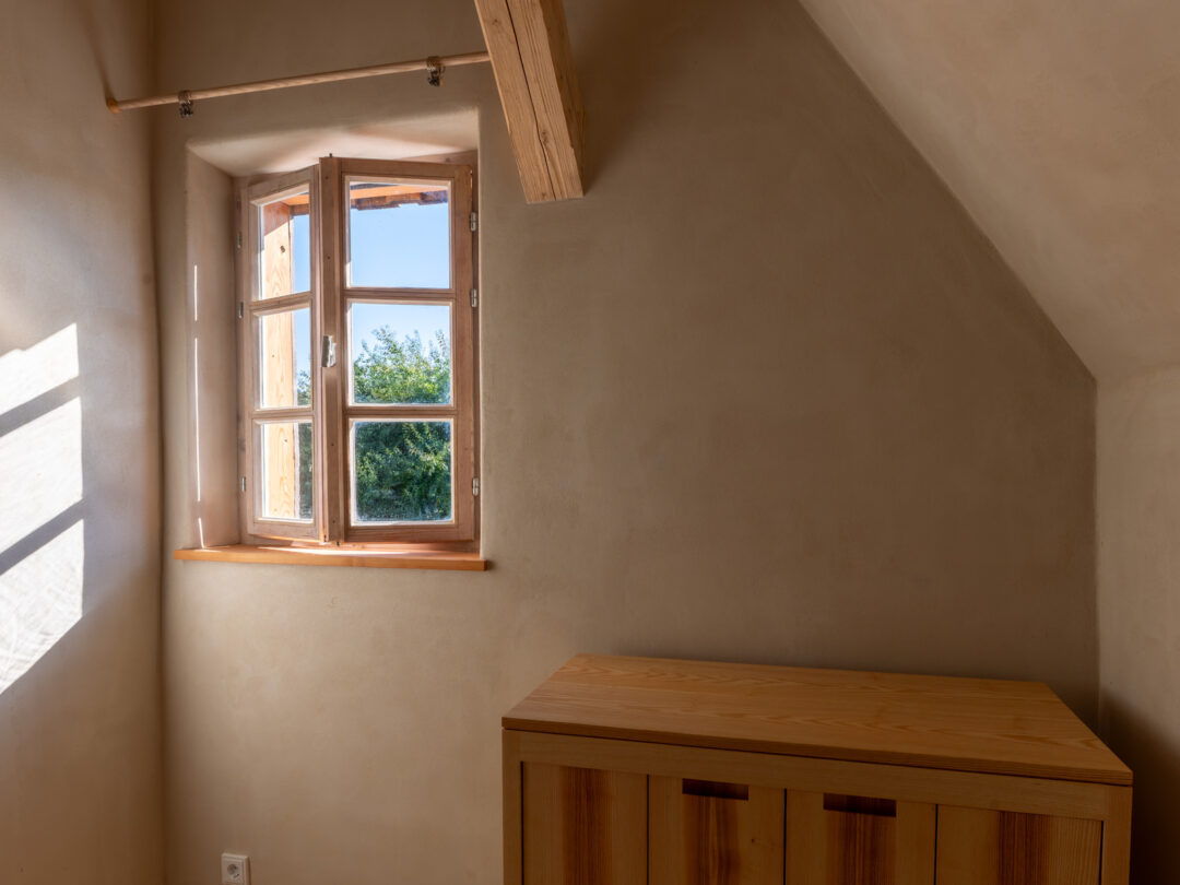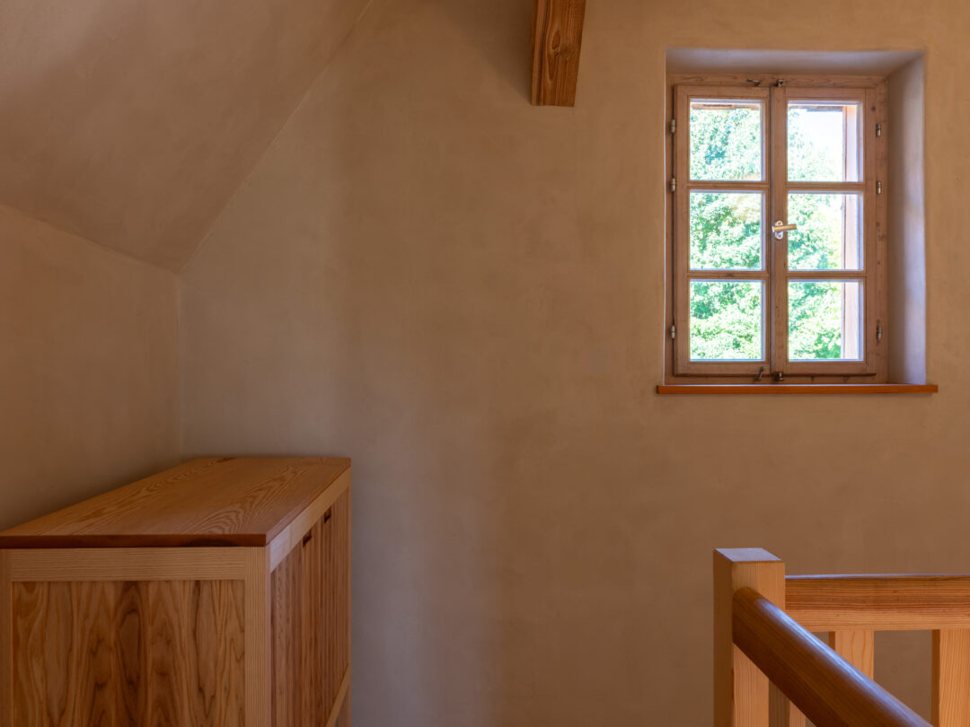 - Lehmputz (Weißer Edelputz) in hellem Elfenbein-Ton, mit integrierter Wandheizung